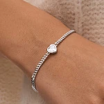 Браслет изготовлен из серебра 925 пробы, покрыт родием. Длина украшения регулируется от 17 до 20 см. Ширина браслета — 2 мм. Размер фианита в форме сердца — 8×8 мм.