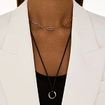 Это утонченное, но дерзкое украшение состоит из черного шнурка из натуральной кожи, мягко обвивающего шею и придающего образу загадочность и выразительность. Центральным акцентом колье является съемная подвеска в виде двух соединенных изящных колечек: одно изготовлено из серебра, а второе — покрыто роскошным желтым золотом, добавляющим теплоты и контраста. Это сочетание биколор создает эффектный визуальный акцент, привлекая восхищенные взгляды.