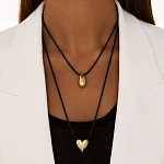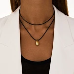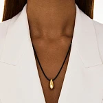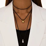 Длина элегантного черного шнурка из натуральной кожи регулируется. Это позволяет легко адаптировать колье под любую глубину декольте! Колье дополнено крупной подвижной подвеской в форме объемной капли в покрытии желтое золото.