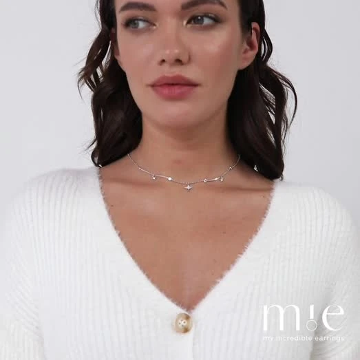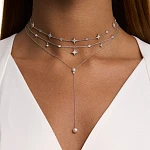 Это загадочное украшение воплощает магию ночного неба в серебре. Тонкая цепочка, украшенная круглыми фианитами и мерцающими звёздами-подвесками, создаёт эффект падающих звёзд, где каждый элемент переливается холодным светом родиевого покрытия.