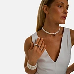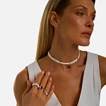 Две нити безупречного натурального жемчуга гармонично дополнены серебряными вставками. В центре композиции — крупный корунд насыщенного винного оттенка в чувственной огранке Груша, напоминающий спелый гранат с солнечных склонов Этны.
