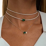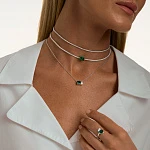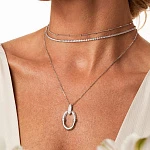 Колье изготовлено из серебра 925 пробы, покрыто родием. Длина колье — 30-35 см и 40-45 см, ширина — 2 мм. Вставка — фианиты.