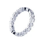 Символом любви и нежности стали ограненные прозрачные фианиты, расположенные по всему периметру кольца. Они зафиксированы глухой закрепкой: серебряный пояс надежно держит каждый камень, снижая риск повреждения до минимума.