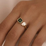 Вдохновленное романтичной французской традицией, это кольцо в стиле Toi et Moi («ты и я») воплощает идею единства. Два крупных фианита: белый в огранке груша и зеленый - квадрат, переливающихся подобно драгоценным камням, символизируют неразрывную связь, сохраняя при этом чистоту современного дизайна.