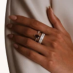 Две дорожки сверкающих фианитов дополнены главными символами лимитированной коллекции ЭРОС — пронзительной серебряной стрелой и натуральным гранатом в огранке Груша. Натуральный камень, напоминающий застывшую каплю крови, является чувственным центром композиции. Его густой винный цвет символизирует любовь, пылающую от прикосновения стрелы Эроса. Изысканная огранка подчеркивает игру света, а эргономичная форма делает кольцо удивительно комфортным.