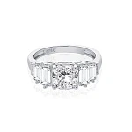 В центре композиции находится величественный белый фианит в огранке Кушон, который привлекает внимание своей глубиной, многочисленными гранями и необыкновенным сиянием. Его обрамляют крупные белые фианиты в классической огранке Багет, добавляющие кольцу особую строгость. Эти камни создают потрясающий контраст, усиливая игру света и подчеркивая уникальность дизайна.