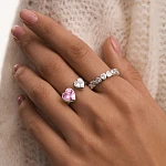 Два фианита на концах серебряного ободка, белый и розовый в огранке сердце, словно тянутся друг к другу, поэтому такой вид колец иногда называют “кольцо-поцелуй”. Разомкнутая форма кольца позволяет регулировать его размер прямо на пальце. Тактильно приятная поверхность кольца дарит ласковое прикосновение, созданное с любовью на нашем производстве MIE ATELIER.