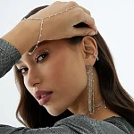 Изделие выполнено из серебра 925 пробы и покрыто родием. Длина — 95 мм. Ширина — 15 мм. Диаметр фианитов — 4 мм.