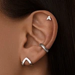 Родиевое покрытие придает серьгам зеркальный блеск, подчеркивая чистоту линий и делая украшение заметным даже при своем миниатюрном размере. Особенность конструкции заключается в том, что изящная галочка не просто прилегает к уху, а деликатно обрамляет его, создавая иллюзию продолжения естественного контура.