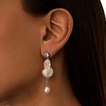 Сверкающий белый фианит в сочетании с крупной барочной жемчужиной пленяет своей чувственной эстетикой! Легкая подвеска добавляет украшению динамики и движения. Фирменная деталь MIE: заниженная игла серьги, что позволяет эстетично скрыть прокол в ухе.